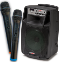 Kaksi UHF-alueella toimivaa langatonta mikrofonia tekevät italialaisen Audio Pro:n aktiivikaiuttimesta täysin itsenäisen äänentoistosysteemin.