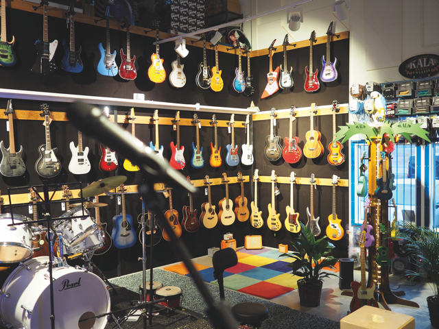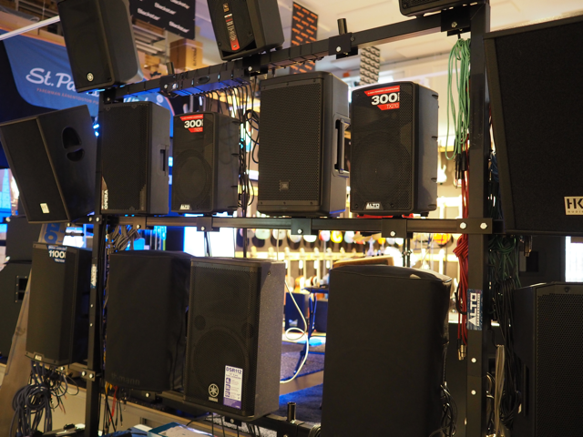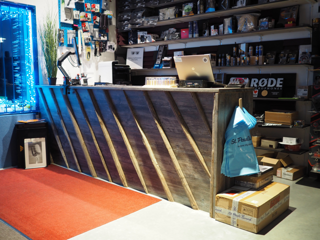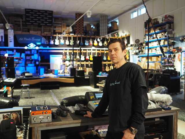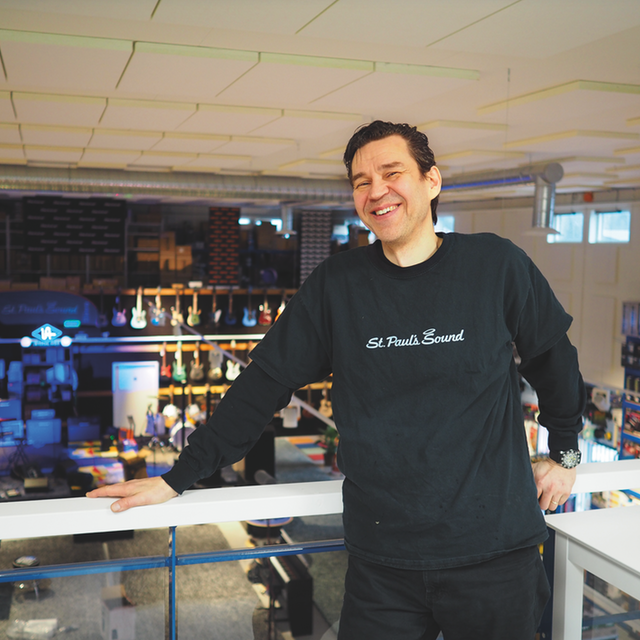 St. Paul’s Soundin hallimyymälässä on korkeutta hulppeat kuusi metriä, ja esiintymislavalla päästään tuote-esittelyiden lisäksi järjestämään vaikka videoitavia minikonsertteja.