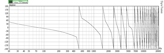 Kuva 1.) Aikaeron ollessa kahden signaalin välillä 1 ms vaihevasteessa tulee 360 astetta täyteen 1 kHz:n taajuudella. Kaikki mittaukset on tehty sähköisesti, jotta ilmiö on luettavissa selvästi. Kaiuttimilla samat ilmiöt tapahtuvat, mutta hieman lievempinä. Itse asiassa ilmiö löytyy mistä tahansa äänentoistoon liittyvästä, kun lähteitä on useampia kuin yksi. Esimerkiksi mikrofoneja käytettäessä painitaan saman ilmiön kimpussa.