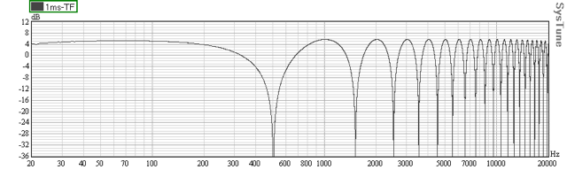 Kuva 2.) 1 ms aikaeron aiheuttamat muutokset vaihevasteessa näkyvät kampasuotimena taajuusvasteessa. Ensimmäinen montuista on leveydeltään oktaavi, ja tästä ylöspäin mentäessä nämä vaimentumat kapenevat.