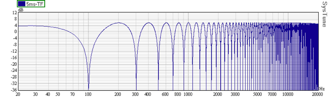 Kuva 4.) Aikaero on samat 5 ms, kuten kuvassa 3. Nyt toista signaalia on vaimennettu 6 desibeliä ja kampasuodin lieveni dramaattisesti.