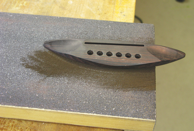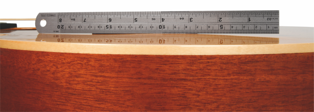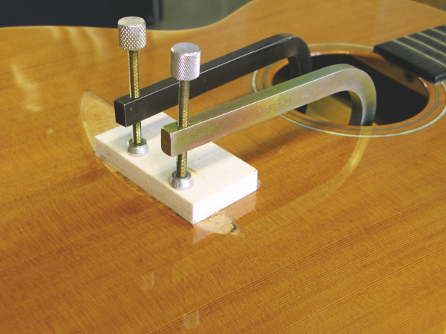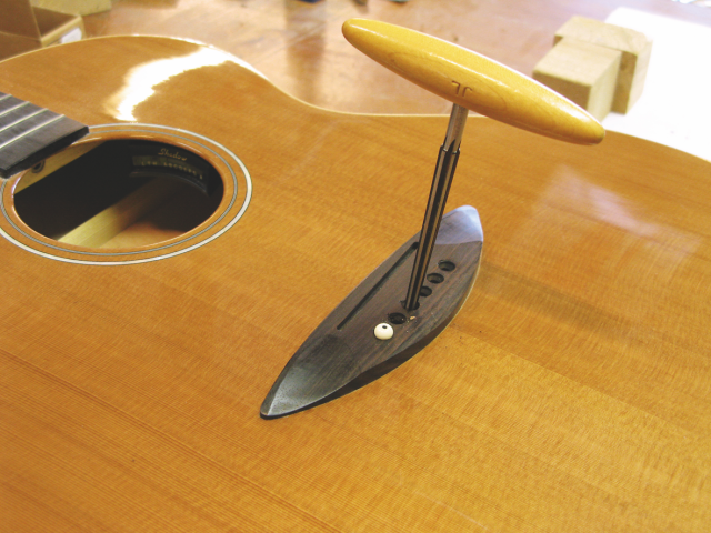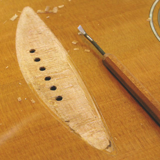 – Tässä kitarassa talla on liimattu osittain kannen lakkauksen päälle, mistä seuraa melko huonosti kestävä liitos. Tallan pitäisi olla koko pinta-alaltaan suorassa kosketuksessa kansipuuhun.