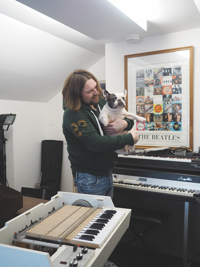 Matti Kari ja studiokoira Maisa kuvauksen kohteen, M400-Mellotronin vierellä – soittimen, jonka ”kaikki haluaa heti levylle, kun vaan näkee sen”.