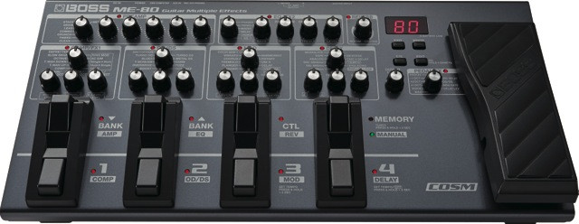 Boss ME-80 tarjoaa kahdeksan samanaikaista tehostetta ja valikoimasssa on mm. GT-100-mallista lainattuja COSM-vahvistinmallinnoksia, modulaatioefektejä, säröjä, ja sokerina pohjalla 38 sekunnin loopperi.