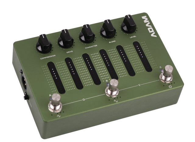 Darkglass Adam on varustettu kolmella kytkimellä, jotka toimivat sekä kiertokytkiminä että jalkakytkiminä. Pyörittämällä kytkintä A voidaan vaihdella kompressiosuhteita tai kytkeä kompressori bypass-tilaan.
