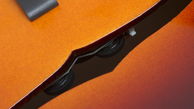 Esivahvistimen volume- ja eq-säätimet on piilotettu huomaamattomasti ylemmän f-aukon reunaan, ja sen paristolokero puolestaan löytyy soittimen sivusta, mikä mahdollistaa näppärän vaihdon.