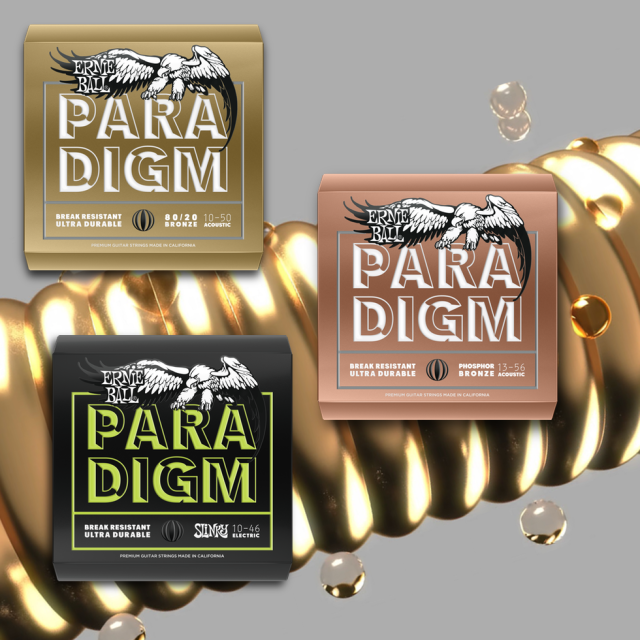 Ernie Ball Paradigm -sarjasta löytyy kieliä niin sähkökitaralle kuin akustisellekin. Ensimmäiselle on tarjolla viisi settiä seuraavilla paksuuksilla: 9-42, 9-46, 10-46, 10-52, sekä 11-48.