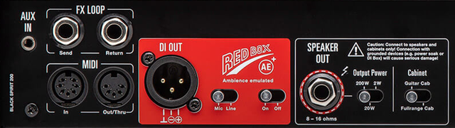 Hughes & Kettner Black Spirit 200 on varustettu Red Box AE + -kaiutinsimulaatiolla, joka pitää sisällään kahdeksan emuloitua kitarakaappia. DI-lähtö voidaan valita mikrofoni- tai linjatason välillä.