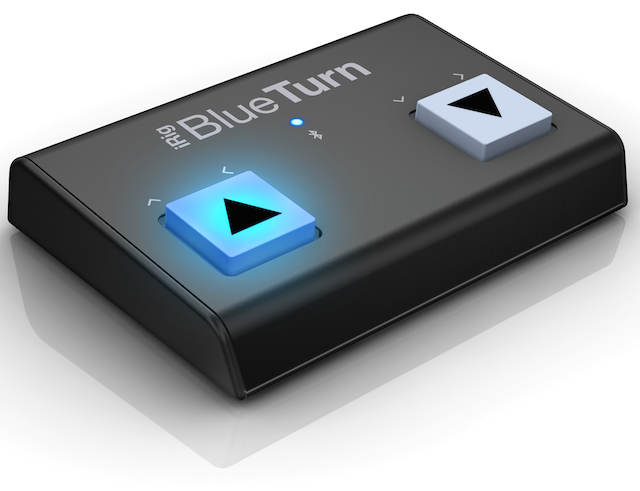IK Multimedian tuore iRig Blue Turn on näppärän kokoinen apuväline, jonka kahdella taustavalaistulla painokytkimellä voi kääntää nuotin sivuja soiton ohessa, kun katselulaitteena on iPhone, iPad, iPod touch, Mac-tietokone tai Android-laite.