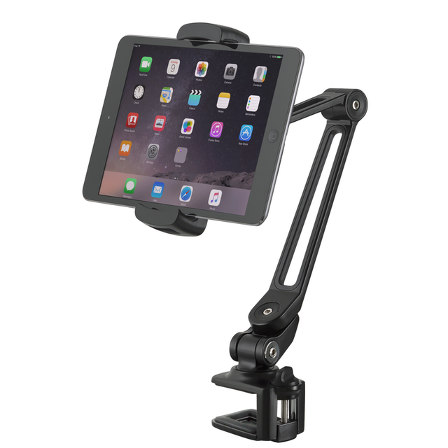 Mikki- ja nuottiständeihin sekä erilaisiin telineisiin erikoistunut K&M on esitellyt uuden pöytälevyyn kiinnitettävän ja kääntyvän telineen tableteille ja puhelimille.