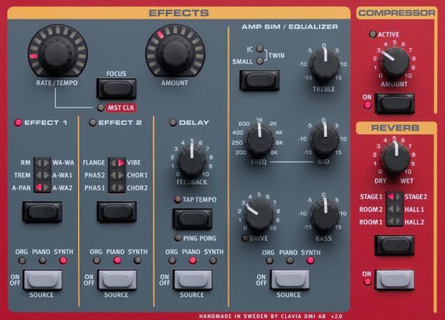 Sointimaailma on jaettu kolmeen kategoriaan, urku-, piano- ja synaosastoon, joille jokaiselle määritellään omat efektinsä.