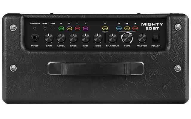 NUX Mighty 20BT on varustettu Type- ja FX Parameter -säätimillä, joilla efektien valitseminen ja niiden parametrien säätäminen onnistuu.