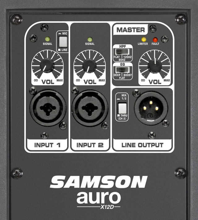 Auro X12D:n ja Auro X15D:n takalevyssä on liitännät kahdelle mikrofoni/linjatulolle omin voimakkuudensäätimin. Bassoleikkurille on kaksi valinnaista rajatajuutta ja soundin luonnetta voi lisäksi passata käyttötilanteeseen esiekvalisoinnilla, jolle on kolme eri varianttia. Lähtöliitännän osalta voidaan valita eteenpäin vietäväksi joko vain toinen tulokanavista tai sitten molemmat.